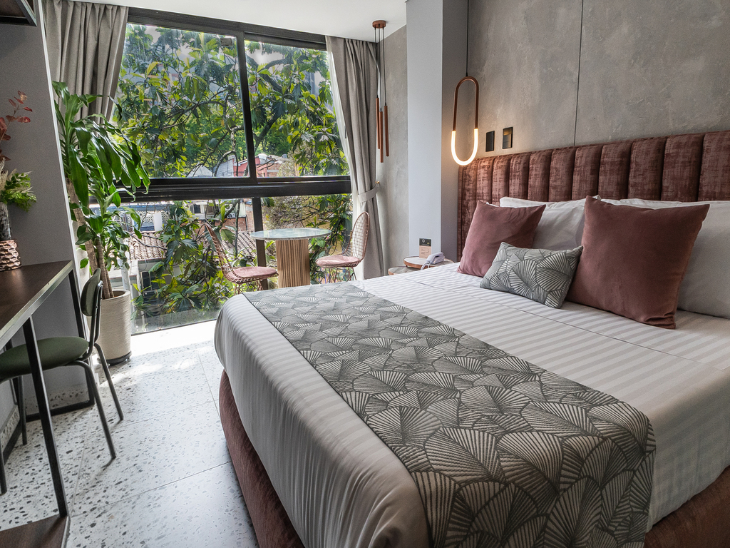 Diseñada para quienes valoran la comodidad con un toque sofisticado, la Estándar Doble ofrece 15 m² de ambiente cálido y funcional. Su cama doble invita a un descanso reparador, mientras el escritorio crea el espacio ideal para trabajar o planificar tu estancia en Medellín. Disfruta de detalles pensados para tu bienestar, como minibar, caja fuerte, televisión, internet de alta velocidad y un baño equipado con productos de aseo de calidad.